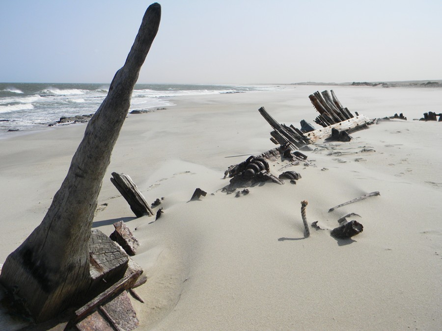 Schiffswracks am Strand. Die Holzkonstruktion ist weitgehend