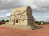 Wir erreichen zuerst die bisherige Gedenkstätte. Nach dem gesicherten Einfahrtstor empfängt einen unübersehbar ein steinernes Denkmal in Form eine riesigen Planwagens, das man vielleicht auch in Nordkorea vermuten könnte.