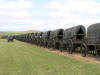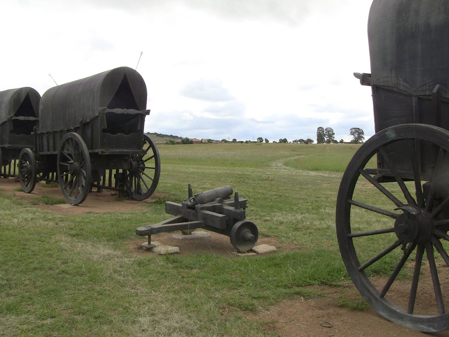 500 m weiter befindet sich die naturgetreue Nachbildung der Wagenburg aus 64 Planwagen (diese aus Haltbarkeitsgründen nun aus Metall). Drei Lücken im Verteidigungsring (nicht zwei wie im RF steht) wurden mit Kanonen abgesichert und sorgten mit dafür, dass es am Schluss dieser grausamen Schlacht über 3000 tote Zulus, aber keinen toten Weißen gab. Warum jedoch die Zulus überhaupt in den von vorne herein aussichtlosen Kampf gingen, bleibt für uns unverständlich