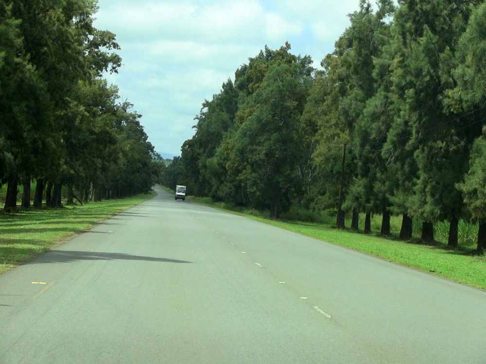 Kurz vor der Grenze zu Mosambik biegen wir auf die südwärts führende 571 ab. Die kaum befahrene Straße gleicht eher einer Allee mit breitem Grünstreifen an den Rändern und prächtigen Bäumen. Links und rechts abwechselnd Maisfelder, sowie Zuckerrohr- und Bananenplantagen soweit das Auge reicht.