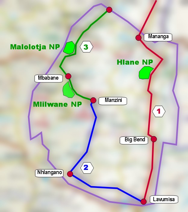 Manzini - Mlilwane NP (*) - Mbabane - Malolotja NP (**) - Piggs Peak - Phophonyane NP |