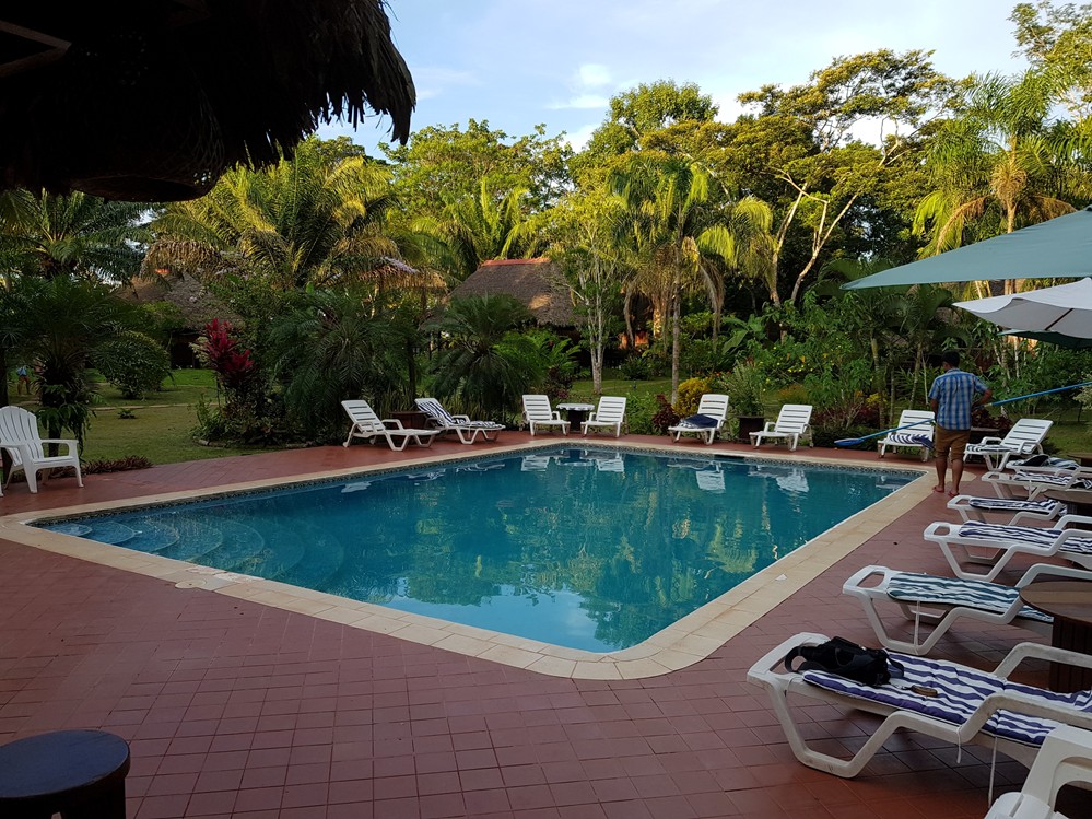 Derweil erwartet uns eine völlig neue Klimasituation, wir befinden uns nämlich jetzt im nur 200 m hohen Amazonastiefland und kämpfen mit 30 ° C und einer Luftfeuchtigkeit von 80 %. Unsere Lodgeanlage liegt gut 30 Bootsminuten flussabwärts und entpuppt sich als wahres Paradies. Die einfachen schilfgedeckten Holzhäuschen liegen in einem tropischen Garten, neben der üppigen Vegetation können wir farbenprächtige Papageien und dachsgroße Verwandte der Meerschweine bewundern. Es gibt zwar nirgendwo Klimaanlagen, aber dafür einen schönen Pool. Strom gibt es nur zweimal am Tage, gut, dass die meisten sicherheitshalber Taschenlampen dabei haben, denn die Nacht ist rabenschwarz. Nach Einbruch der Dunkelheit folgt der erste Ausflug mit dem Boot. Langsam gleiten wir über den Fluss, während unsere Führer mit einem starken Spotlight die Ufer nach Kaimanen absuchen, und tatsächlich können wir zwei Tiere beobachten. Noch mehr Aufmerksamkeit erweckt allerdings ein Faultier, das in schwindelnder Höhe an einem langen Ast kopfüber hängt.