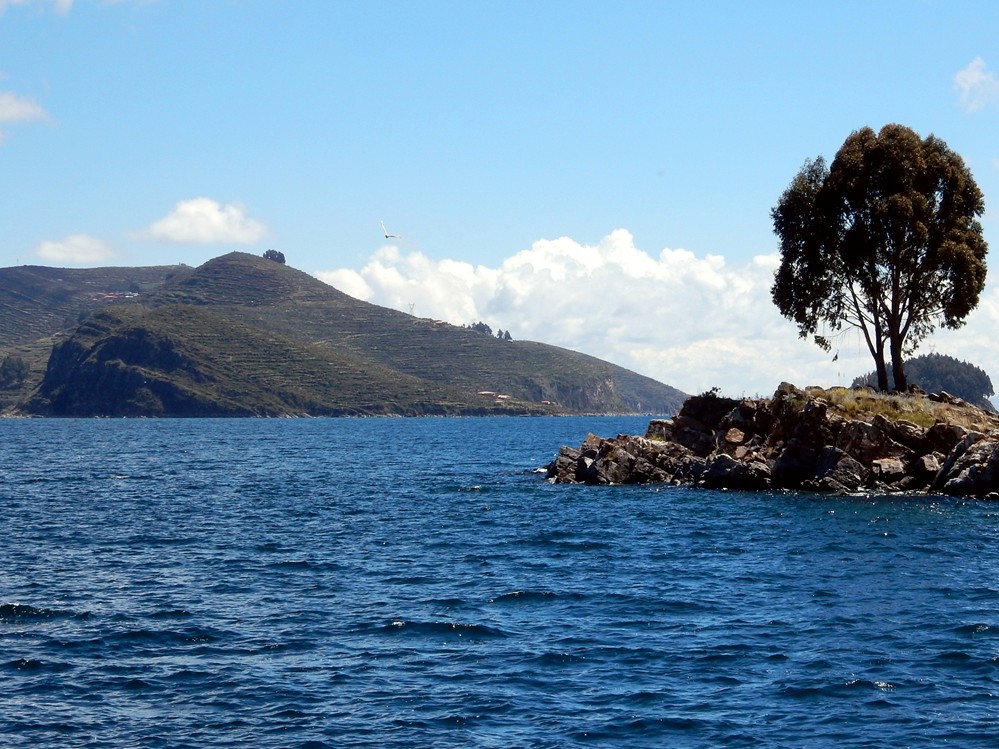 Inzwischen sind wir im Grenzort Kasani, also im östlichen Teil des Sees angekommen. Die Formalitäten der Aus- und Einreise sind schnell erledigt, während unsere Koffer per Lastenfahrräder die Grenze wechseln (Bilder 1 - 3). Natürlich haben wir nun nach nur zwei Stunden wieder eine neue Reiseführung und zwar in Form der sehr sympathischen Manuela, die in Deutschland aufgewachsen ist. Unsere erste Aktion im neuen Land ist, unsere Uhr eine Stunde vorzustellen. Erster Ort auf bolivianischer Seite ist Copacabana, natürlich nicht zu verwechseln mit dem brasilianischen Namensvetter. Das Städtchen liegt knapp 150 km nordwestlich von La Paz und ermöglicht den Zugang zum Titicaca-See von bolivianischer Seite. Die Bevölkerungszahl ist in den letzten Jahrzehnten deutlich angestiegen. Der Ort gilt als der bedeutendste Wallfahrtsort Boliviens. Sehenswert ist die Basilika mit der Figur „Dunkle Jungfrau“ (Bild 4). Anschließend dürfen wir eine Runde über den Markt drehen (Bild 5). Dann geht es zu einem wackeligen Steg, wo ein Katamaran auf uns wartet. Er bringt uns und eine weitere Reisegruppe nach kurzer Fahrt zur Isla del Sol (Bilder 6 & 7). Die ursprünglich Titicaca genannte Insel liegt etwa 1 km vom Festland entfernt. Hier leben in drei verschiedenen Communities etwa 2000 Menschen, die sich zurzeit aber gegenseitig das Leben schwer machen. Auf der Insel befinden sich einige sehenswerte Inka-Ruinen. Wir beschränken uns aber auf eine Schamanenzeremonie (Bild 8) und den Besuch der Quelle der ewigen Jugend, die wir nach 250 Stufen bergauf erreichen. Ob das trinkbare Wasser etwas hilft, werden wir vermutlich erst daheim überprüfen können. Zurück zum Schiff, dort wird während der Weiterfahrt ein köstliches Mittagsbuffet gereicht. Ein kurzer Stopp an der Mondinsel und nach knapp zwei Stunden erreichen wir den Hafen Cotoni. Da es eine Zeit lang dauert, bis unsere Koffer vom Schiff in den wartenden Bus verladen werden, dürfen wir derweil eine kleine Runde in einem der charakteristischen Binsenboote unternehmen, eine wirklich nette Geste des Reiseveranstalters. Natürlich ist es kein originales Boot mehr, denn die Binsen verfaulen alle zwei Jahre und deshalb verwendet man inzwischen zumindest für den Korpus andere Materialien.