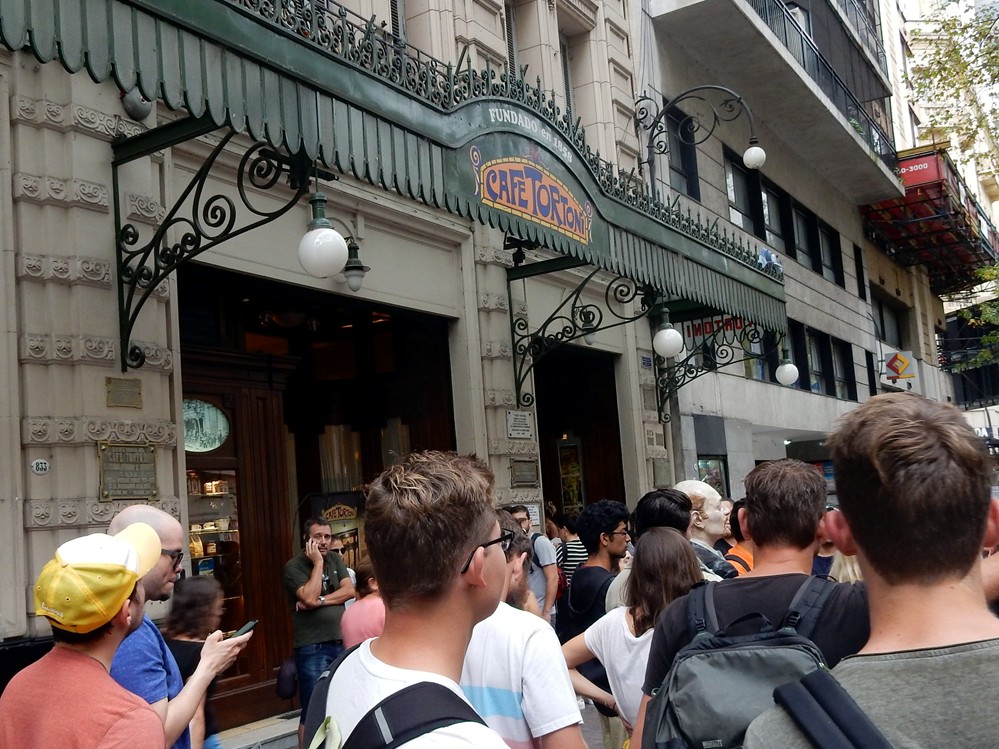 einigermaßen in Grenzen hält. Das Stadtbild wirkt sehr europäisch, man könnte sich genauso beispielsweise in Portugal wähnen. Was am meisten auffällt, ist die Bevölkerung, von indigenen Einflüssen wie in Peru oder Bolivien ist hier so gut wie nichts mehr zu merken. Es gibt viele gut gestylte Damen, aber auch immer wieder welche, die mehr dem US-amerikanischen Lebensstil frönen. Weiter stellen wir fest, dass es im Gegensatz zu Peru und Bolivien praktisch keine wilden Hunde mehr gibt. Bereits 1913 wurde hier die erste U-Bahn Lateinamerikas eröffnet (erst über 50 Jahre später folgte Mexico City). Heute umfasst das Netz 6 Linien. Daneben gab es früher ein weit reichendes Straßenbahnnetz, dessen Schienenreste man in manchen Nebenstraßen von San Telmo noch entdecken kann. Pläne, das Straßenbahnsystem wieder auferstehen zu lassen, wurden - im Gegensatz zu entsprechenden Hinweisen in Wikipedia – augenscheinlich nicht weiter verfolgt. So wird der größte Teil des ÖPNV noch mit Dieselbussen (150 Linien) oder Taxis (ca. 40.000) bewältigt, was weitgehend für die Lärm- und Schadstoffemissionen verantwortlich ist. Die offiziellen Taxis fahren mit Taxameter und die Fahrkosten sind günstig, allerdings kann es passieren, dass man dem Fahrer – so wie wir es erlebt haben - mittels der Navi-APP auf dem eigenen Handy den Weg zeigen muss. Im Stadtkern bilden die Straßen ein ausgeprägtes Schachbrettmuster, wo vielfach ein Einbahnsystem vorherrscht. Die in Nord-Südrichtung verlaufene Av. 9 de Julio gilt als die breiteste Straße der Welt (10 Fahrbahnen pro Richtung). Sie wird von der 1, 6 km langen Av. de Mayo gekreuzt, die zwischen der Plaza de Mayo und der Plaza des Congreso (Bild 6) das eigentliche Zentrum bildet. Hier liegen wichtige Gebäude wie der Regierungssitz Casa Rosada (Bild 5), die Kathedrale ( die letzte Wirkungsstätte vom jetzigen Pabst Franciscus, Bild 7), das Rathaus El Cabildo, das Café Tortoni, der Palacio Barolo (Bild 9) und der Palacio del Congreso. Die nördlich parallel verlaufende Avenida Corrientes bildet die zweite Hauptachse der Stadt, hier spielt sich das kulturelle Leben ab und deshalb trägt sie auch den Titel Broadway von Buenos Aires. Touristisch interessant ist sicher auch das völlig neu gestaltete Hafenviertel Puerto Madero, wo nur noch die Häuserfronten im Stil der Hamburger Speicherstadt von alten Zeiten zeugen. Buenos Aires ist auch die Stadt der Cafés, am berühmtesten ist das gerade erwähnte Tortoni im prächtigen alten Kolonialstil, doch es ist überlaufen, und meist bildet sich eine lange Schlange vor dem Lokal, wo einem der Türsteher nach und nach gnädig den Einlass gewährt (Bild 10). Und natürlich gibt es hier den Tango. Buenos Aires gilt als Welthauptstadt dieses Tanzes, wobei sich Argentinien mit Uruguay streiten, wer ihn „erfunden“ hat. Aber das kann uns vielleicht egal sein, während wir am Abend eine der unzählig angebotenen Tanzshows bei gutem Essen und freien Getränken besichtigen (ca. 85 US$).