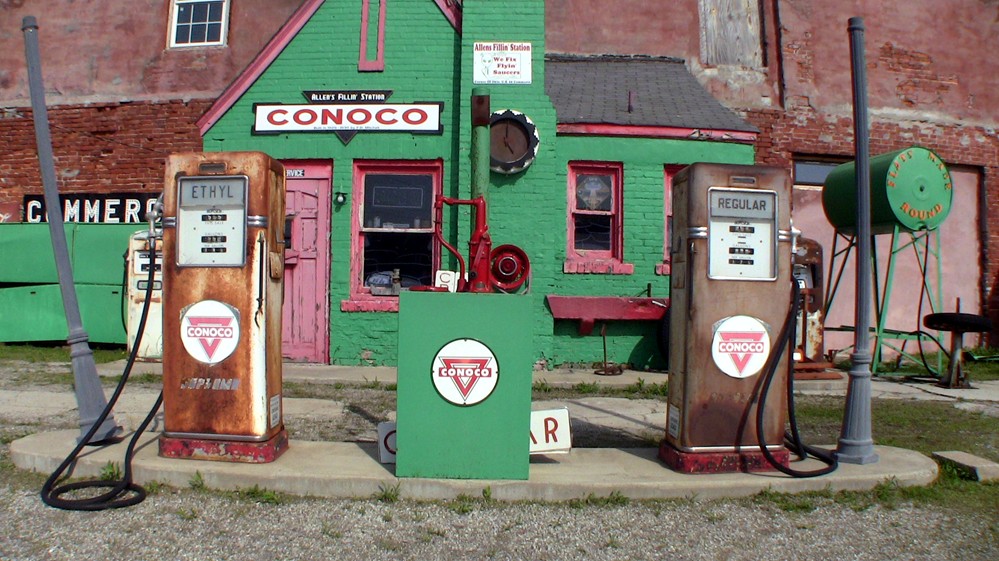 Wir treffen auf die '96'. Bevor es auf ihr weitergeht, machen wir einen kleinen Abstecher hinüber nach Spencer, zu dem noch eine der wenigen alten Eisenbrücken führt. Hier findet die alte Philipps 66 - Tankstelle die volle Aufmerksamkeit. Weiter zur '96'. Diese ist breit und bestens ausgebaut, dementsprechend