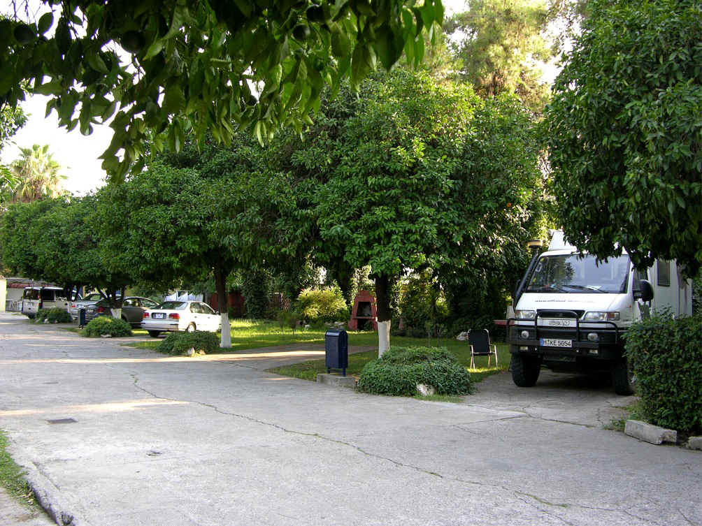 Auf der Straße 400, das ist die zentrale Ost- Westachse, die Stadt nach Osten verlassen. An einer großen neuen Moschee (linke Seite) und einem Friedhof (rechte Seite) vorbei. Kurz danach eine TÜRKPETROL-Tankstelle. Direkt danach rechts durch einen Torbogen. . Ursprünglich liebevoll hergerichtete Anlage mit einzelnen, schattigen Stellplätzen. Der Campingbetrieb ist allerdings inzwischen so gut wie eingestellt. Davon zeugen die erbärmlichen sanitären Anlagen. Der ganze Betrieb lebt anscheinend nur noch von den Tagesgästen, die die große, sehr gepflegte Poolanlage nutzen. Restaurant geschlossen. Sehr laut durch angrenzende Schnellstraße. 230 V, Mietbungalows, Bar. i Eigener Besuch (2005)