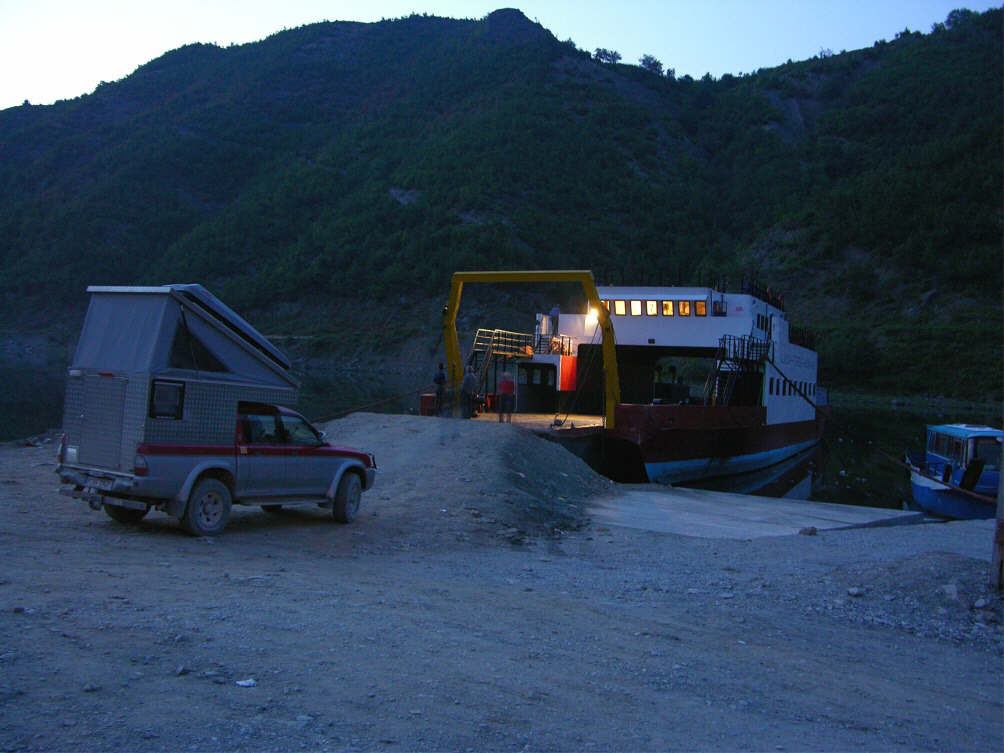 Die Fähre fährt zweimal am Tag nach Komani, einmal um 7.00 Uhr (nicht 8.00 wie im Reiseführer) und um 13.00 Uhr. Wer diese Fähre versäumt und auf den nächsten Tag warten muss, kann unter Umständen gut beraten sein, trotz der wenig anheimelnden Atmosphäre hier zu übernachten, sozusagen in "Pole Position" (Bild 3).