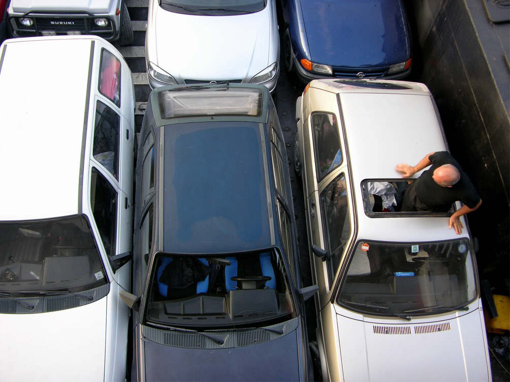 Überraschend pünktlich (nach einem Verlademarathon, in dem die Autos so eng geparkt wurden, dass manche nur durchs Schiebedach - siehe Bild -  entweichen konnten und manchen Kratzer und abgebrochenen Rückspiegeln), sticht die Fähre in See und und gewährt einem wunderschöne 2 ¼ Stunden durch eine faszinierende Landschaft.