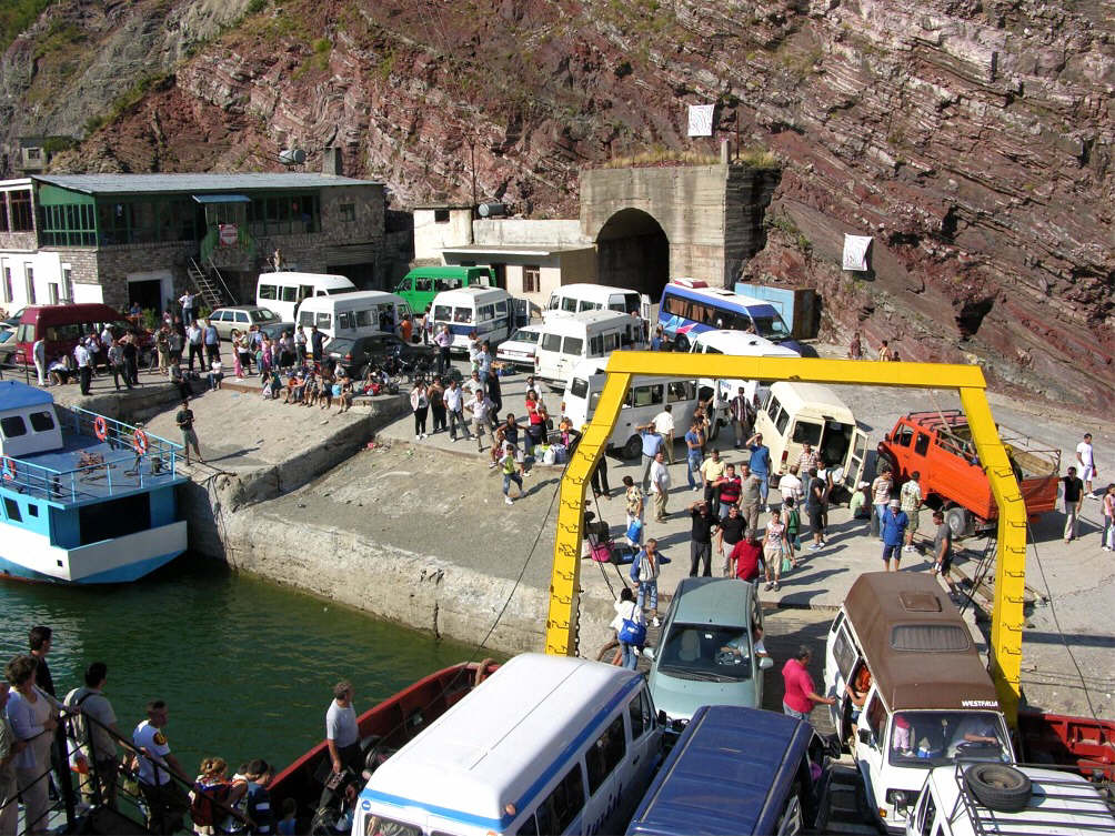 Wir erreichen das Ende des Komani-Sees und damit eine weitere Staumauer. Auf dem engen Schotterplatz zwischen einem Tunnel (durch den früher sicher während der Bauphase das Wasser umgeleitet wurde und der heute als Zufahrt dient) und der Anlegestelle tummeln sich etliche Sammeltaxis, die dafür sorgen, dass die Ausfahrt komplett verstopft ist und somit erstmal gar keine Autos entladen werden können. Also warten alle, bis die sicher 200 Passagiere zu Fuß samt ihrem Gepäck in den Taxis verstaut sind, ehe das erste Auto das Schiff verlassen kann. Wieder viel Hektik und Kampf um jeden Zentimeter.