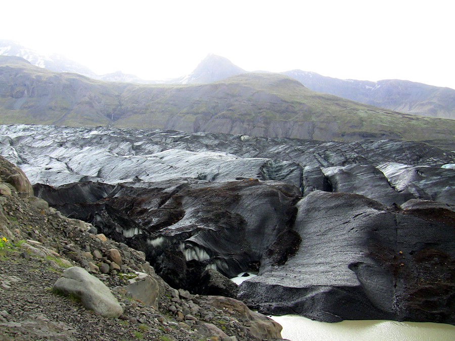 In der Ferne erblicken wir die mächtige Gletscherzunge des Breidamerkurjökull, bei unserem Besuch allerdings mit einer grau bis schwarzen Schicht überzogen. Ob dies mit den beiden Vulkanausbrüchen in den 2010 und 2011 zusammenhängt, konnte nicht ermittelt werden.