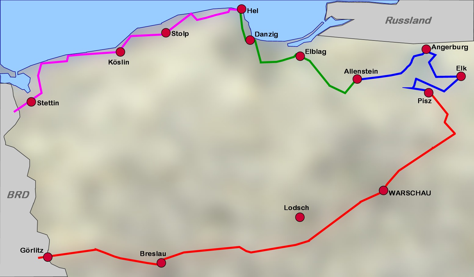 Görlitz - Wrocław (Breslau) - Warszawa* (Warschau) - Łomza - Pisz (Johannisburg) |