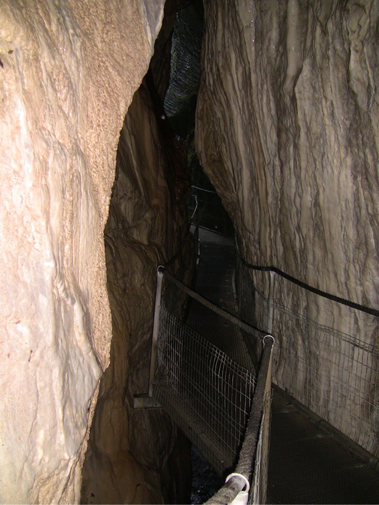 Nach dem Lösen des Tickets (6,60 €) erhält man eine Helm und betritt wenig später die spektakuläre Schlucht(****). Sie wird als die engste Schlucht der Welt angepriesen, und da ist vermutlich nicht daran zu zweifeln. Gut 1400 m lang führt ein etwa 1 m breiter Gitterrostweg ein paar Meter über dem tosenden Bach die Schlucht hinauf, während über einem nur ein winziges Stück Himmel zu sehen ist. An einigen Stellen verläuft der Weg ganz geschlossen durch Gänge oder Höhlen.120 Höhenmeter sind bis zum Ende der Strecke zu bewältigen, da ist schon einige Kondition gefragt. Unterwegs gibt es ein paar Ausruhplattformen und Nottelefone.